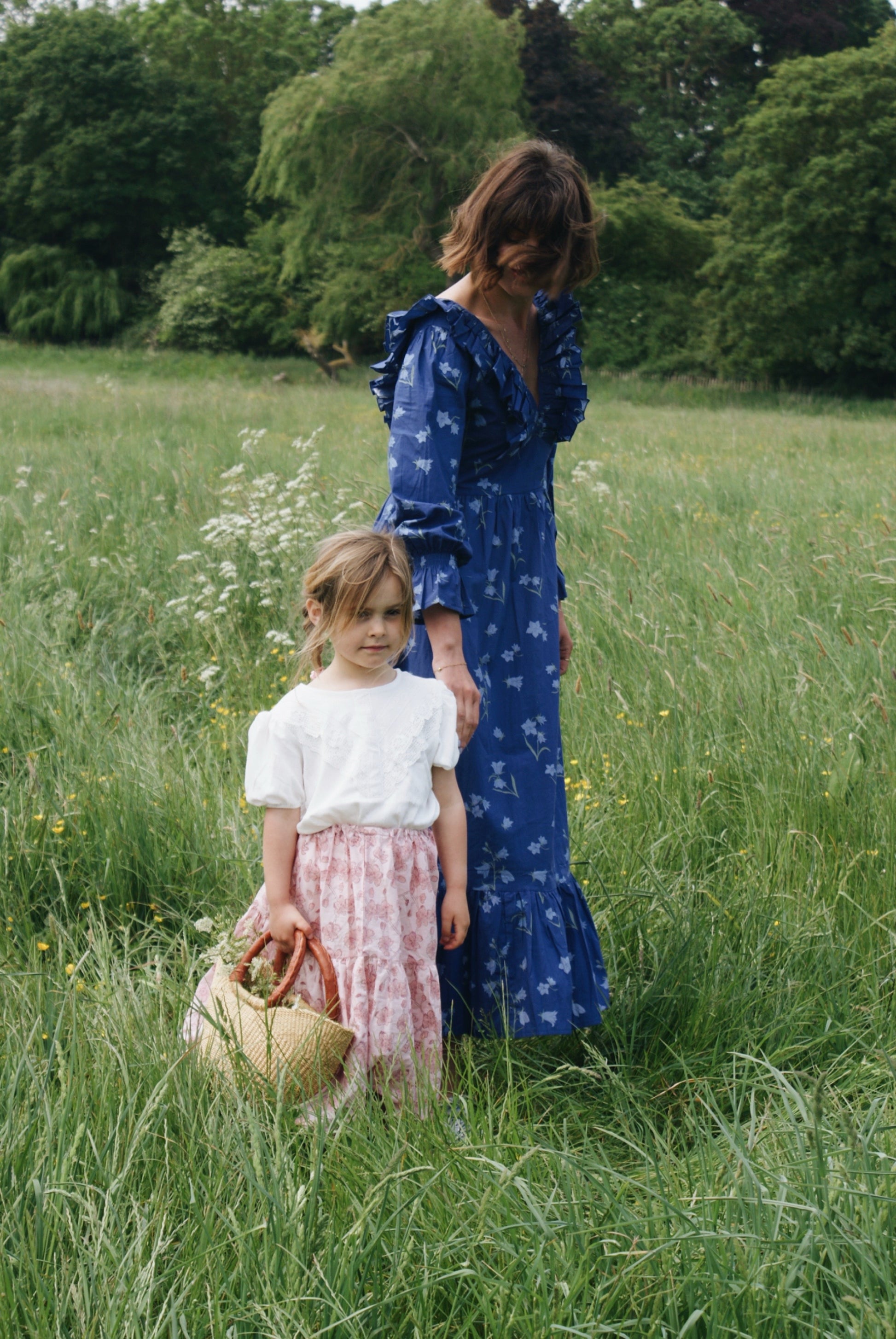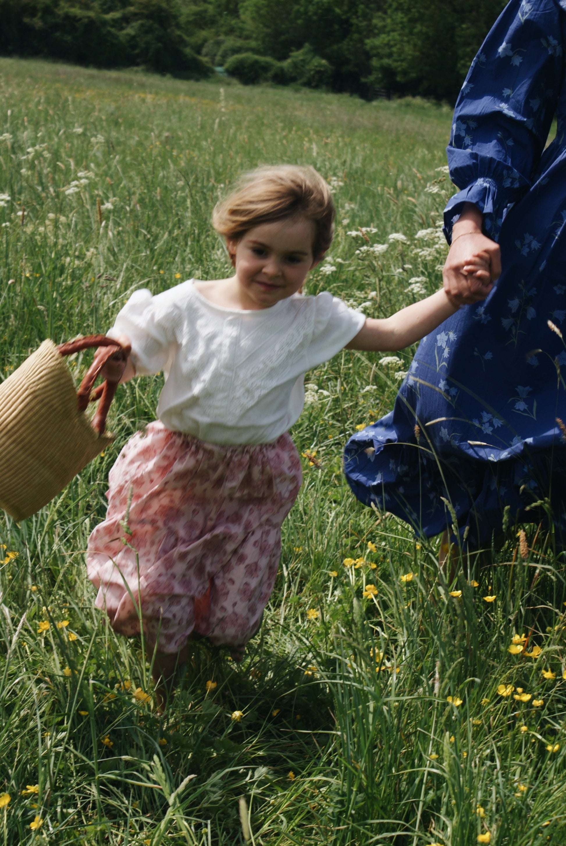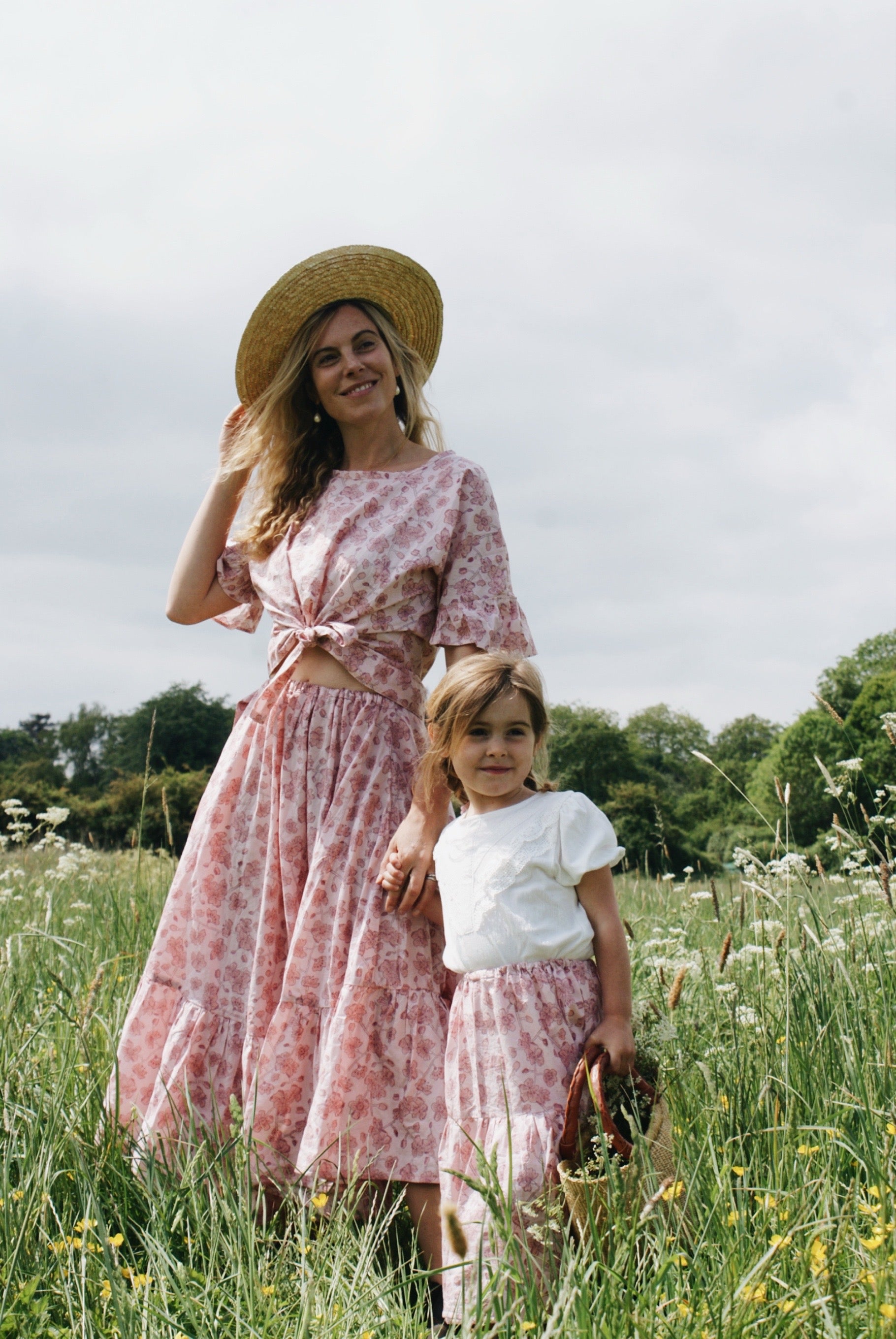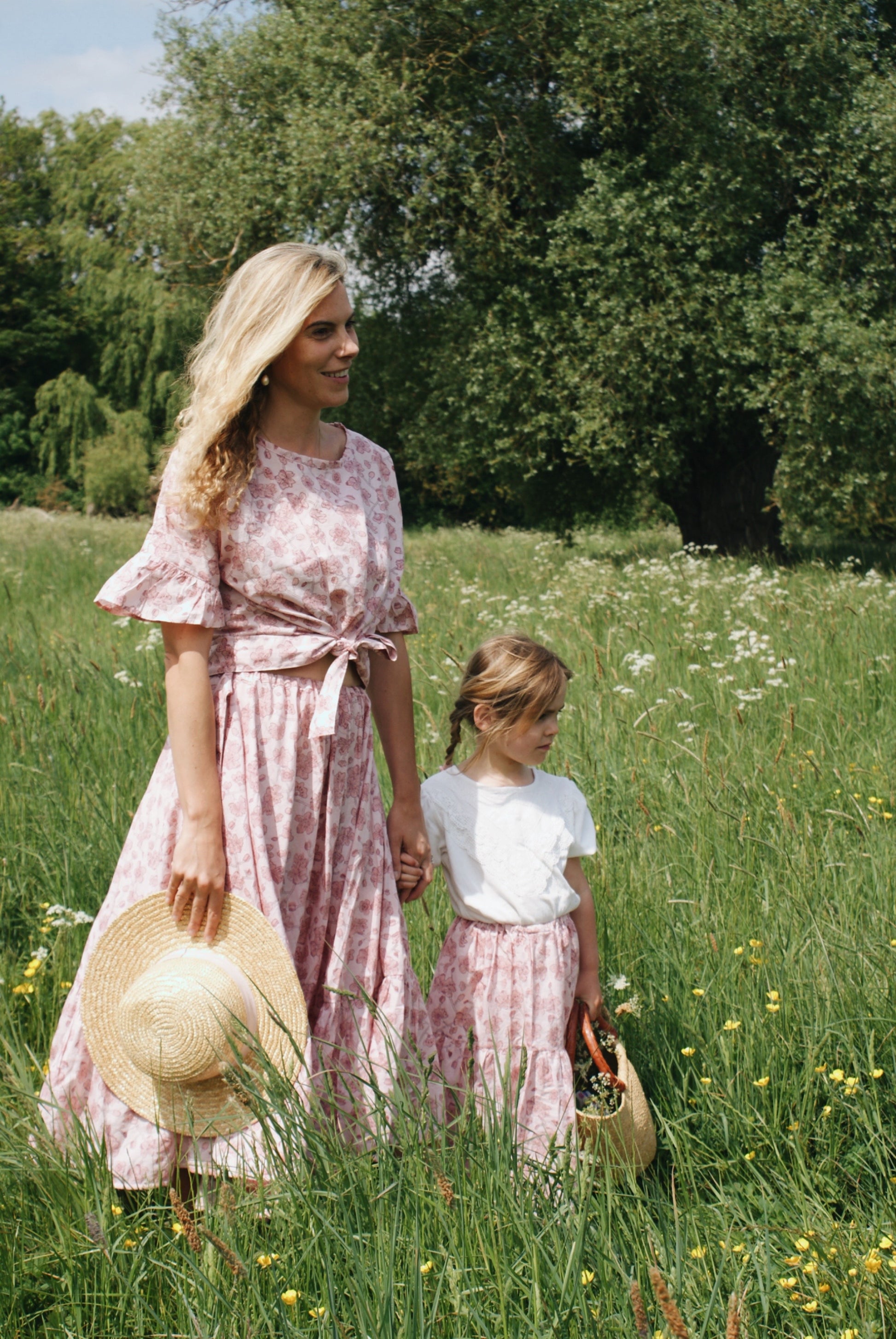The Blossom skirt has been repurposed from surplus block printed pink blossom fabric - pale pink with darker pink blossoms. Made from organic cotton.