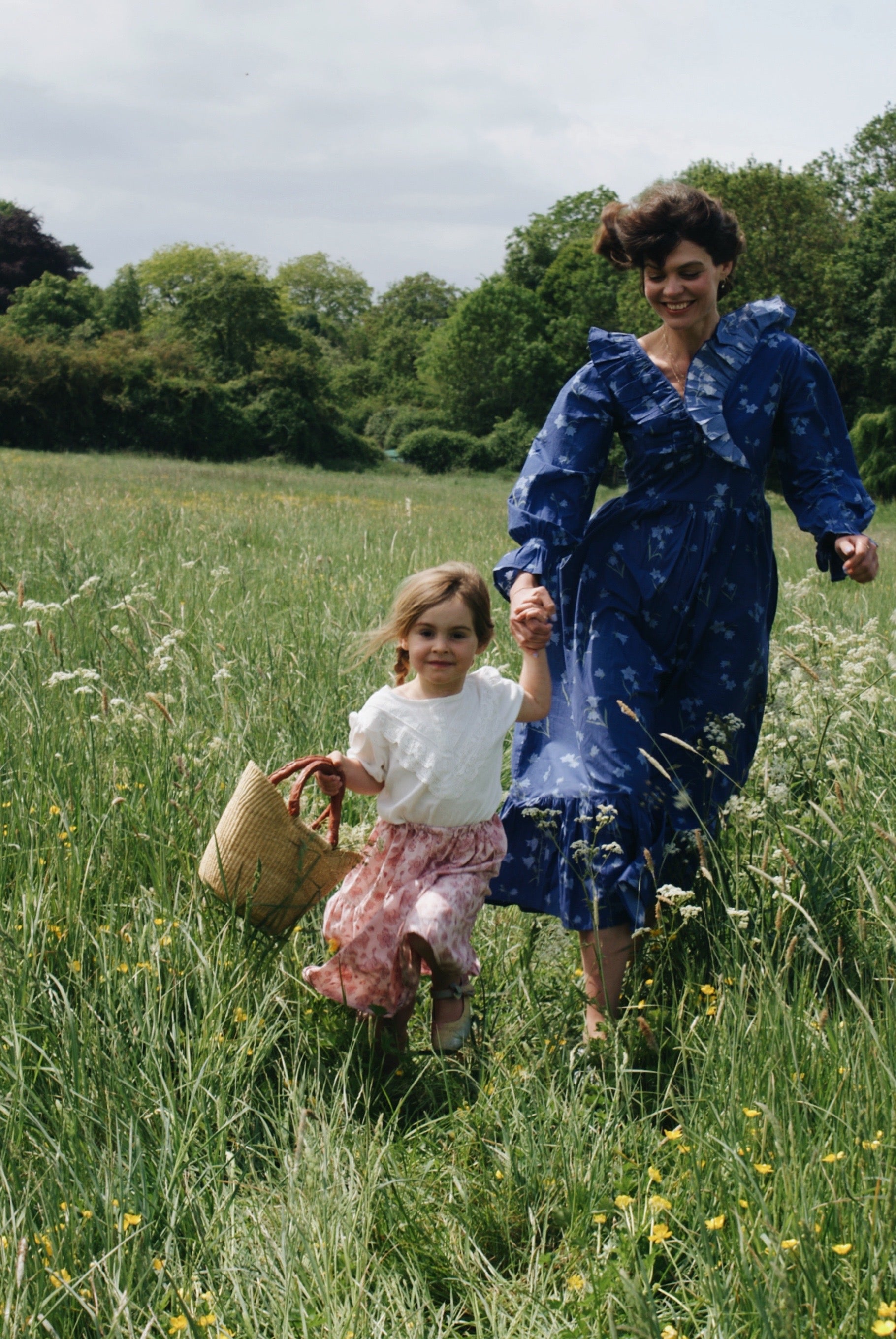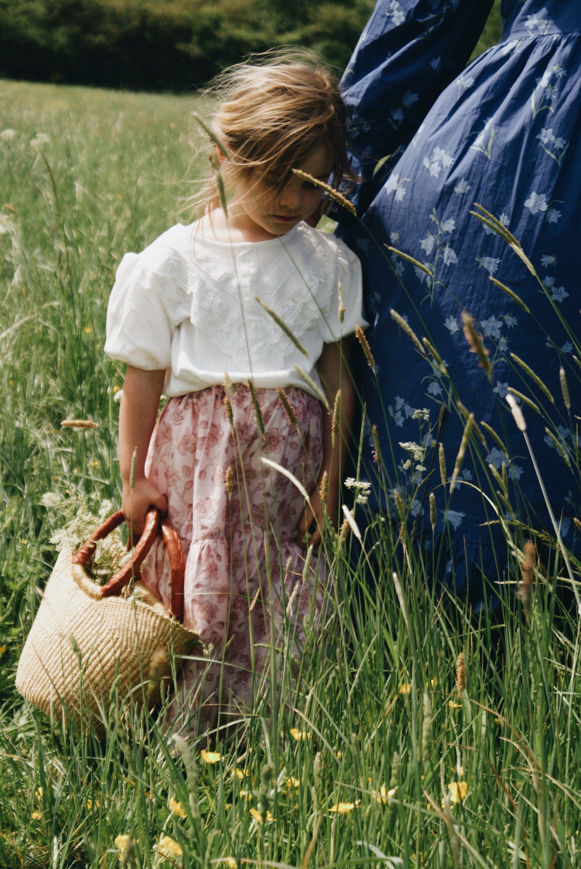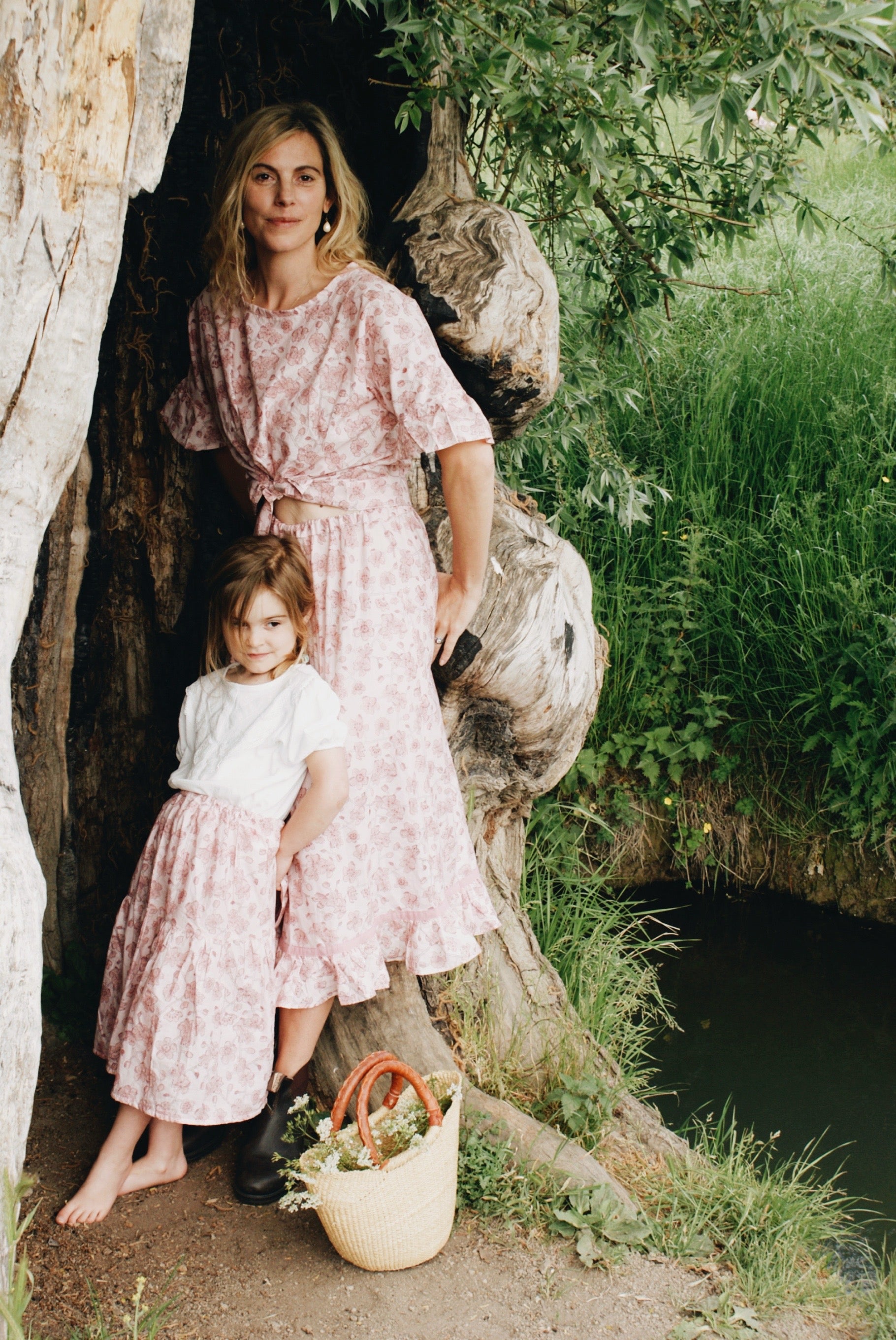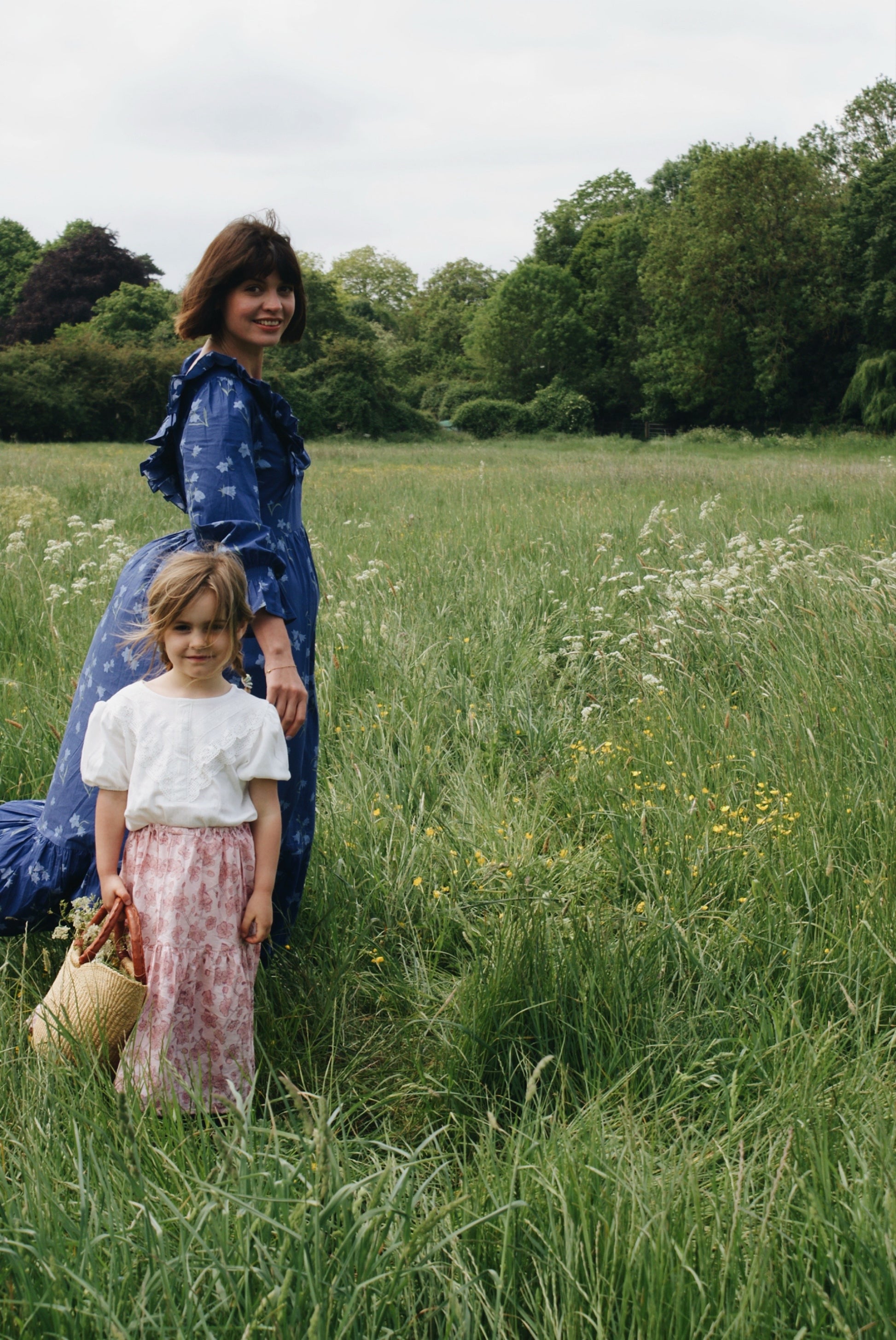 The Blossom skirt has been repurposed from surplus block printed pink blossom fabric - pale pink with darker pink blossoms. Made from organic cotton.
