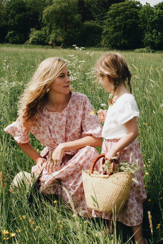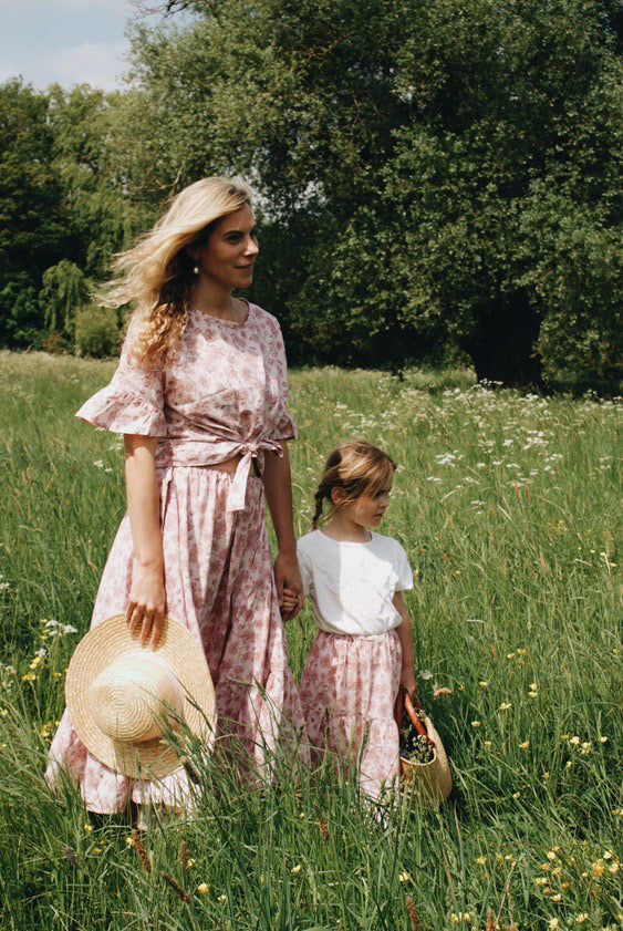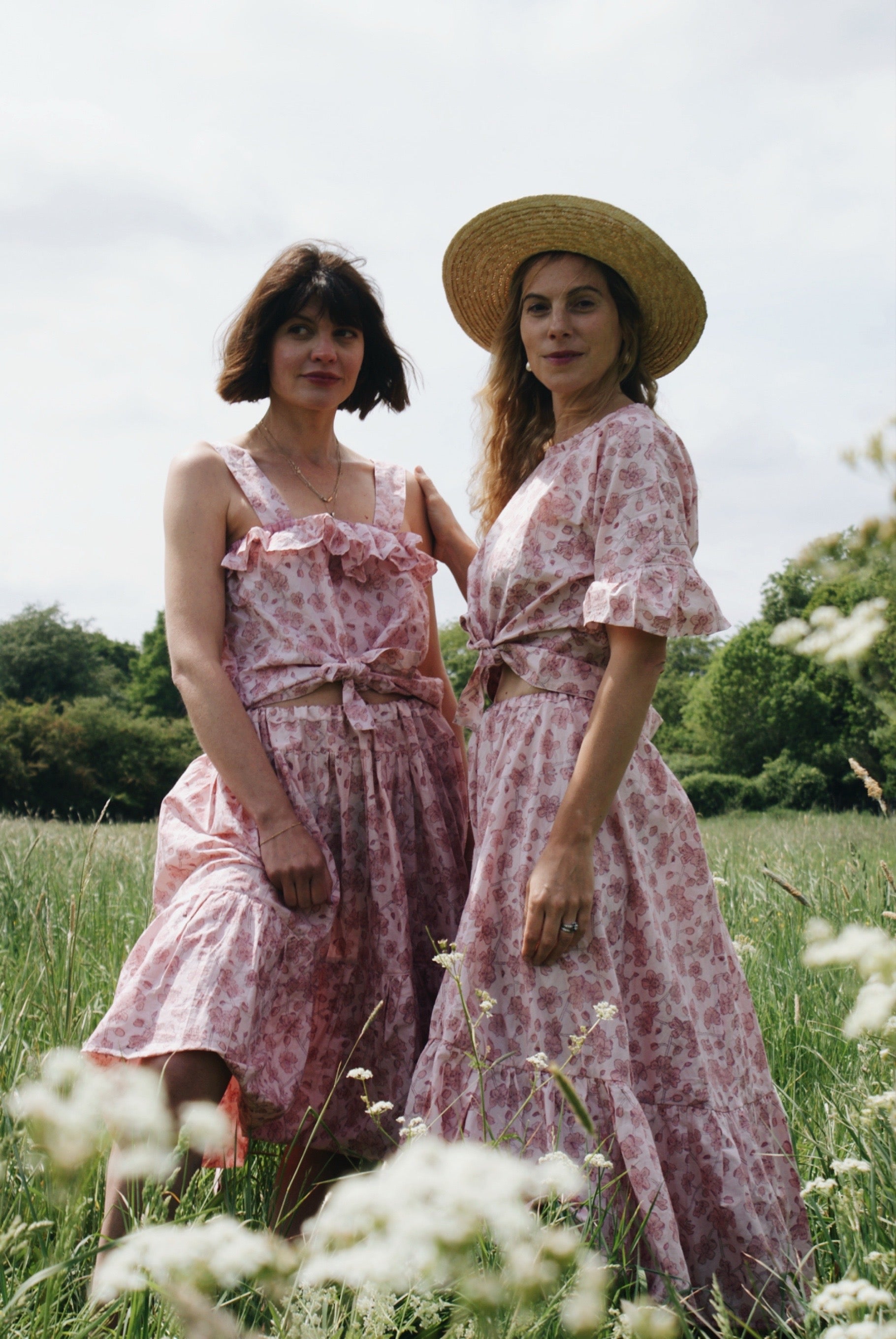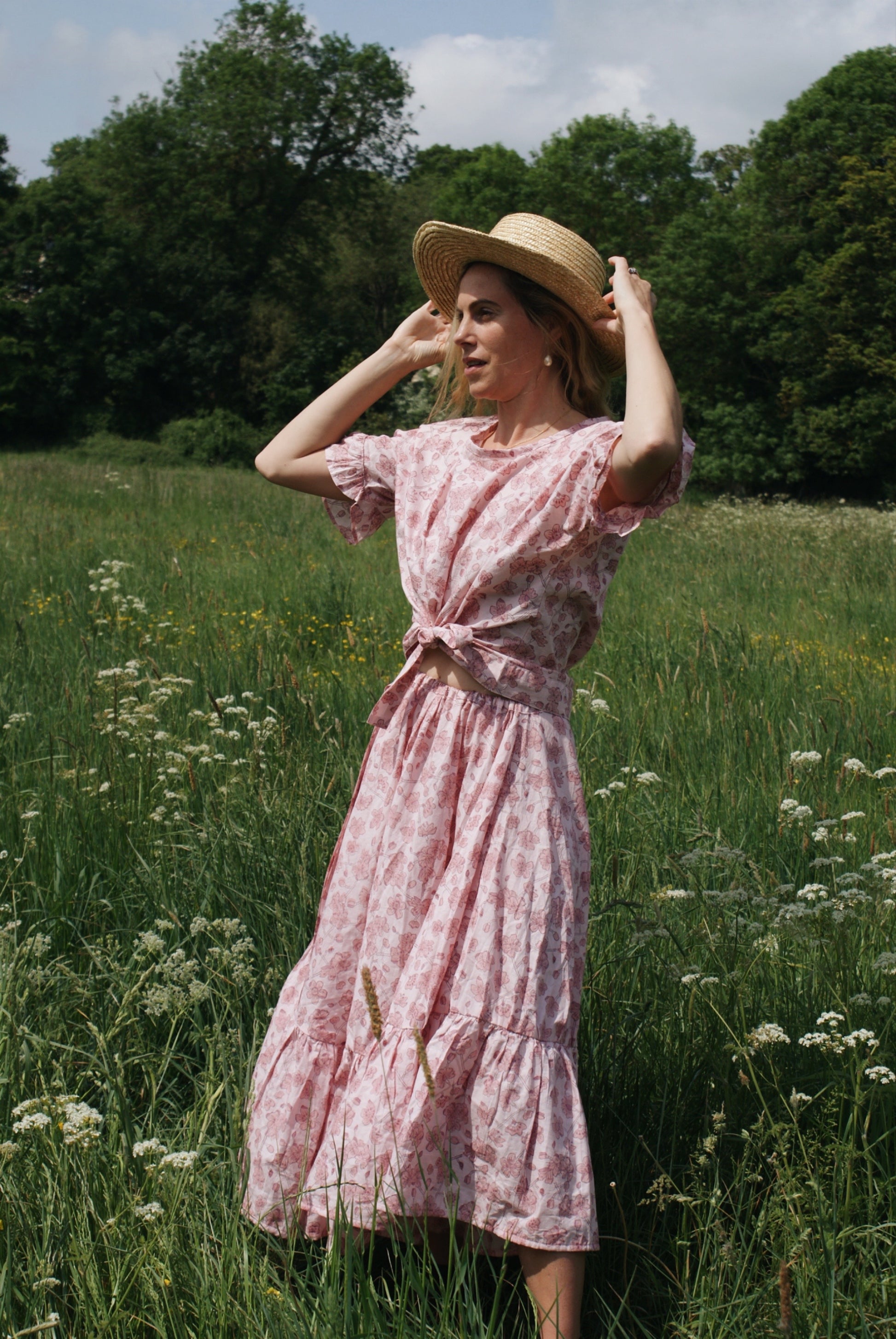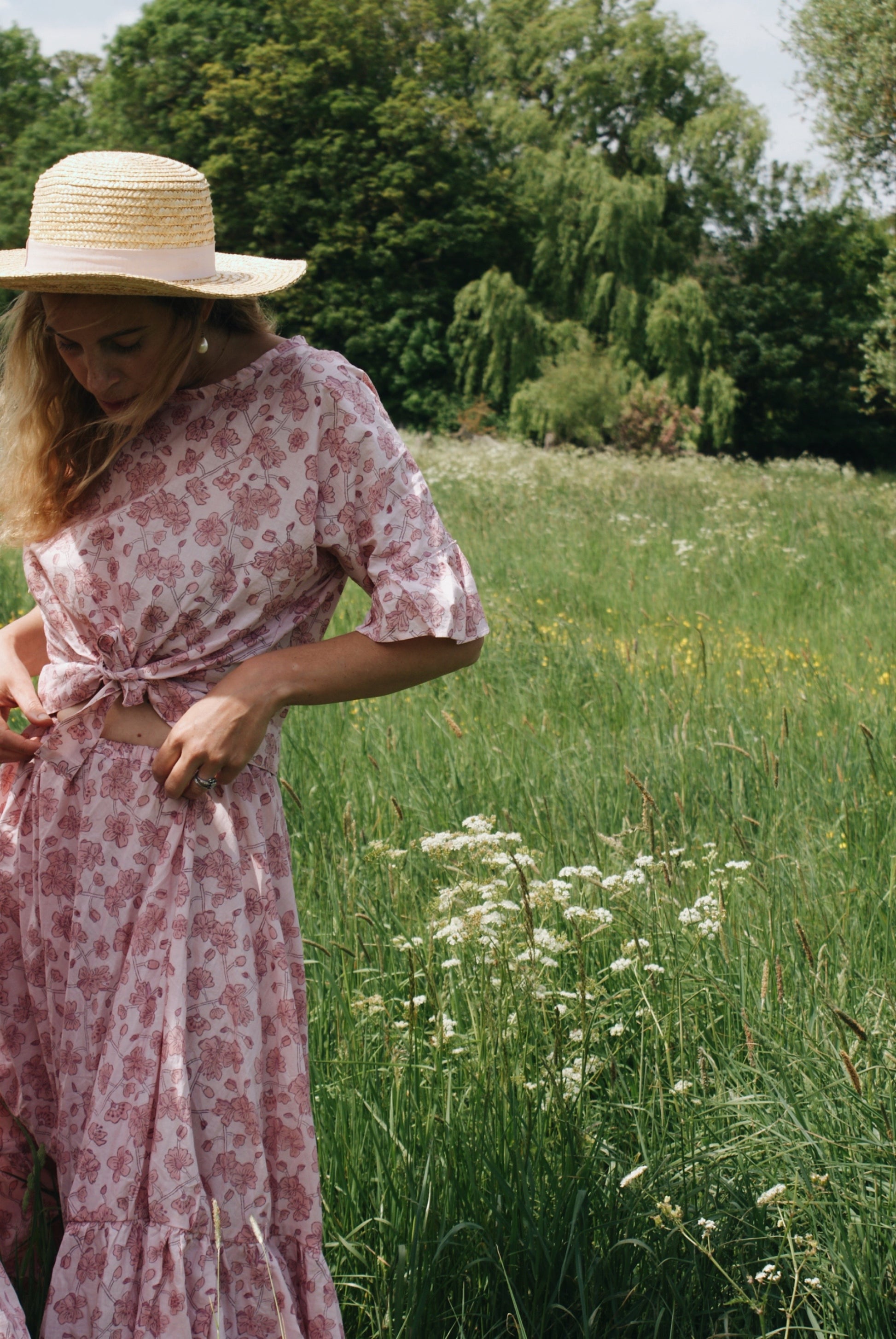 The Blossom blouse has been repurposed from surplus block printed pink blossom fabric - pale pink with darker pink blossoms. Made from organic cotton.