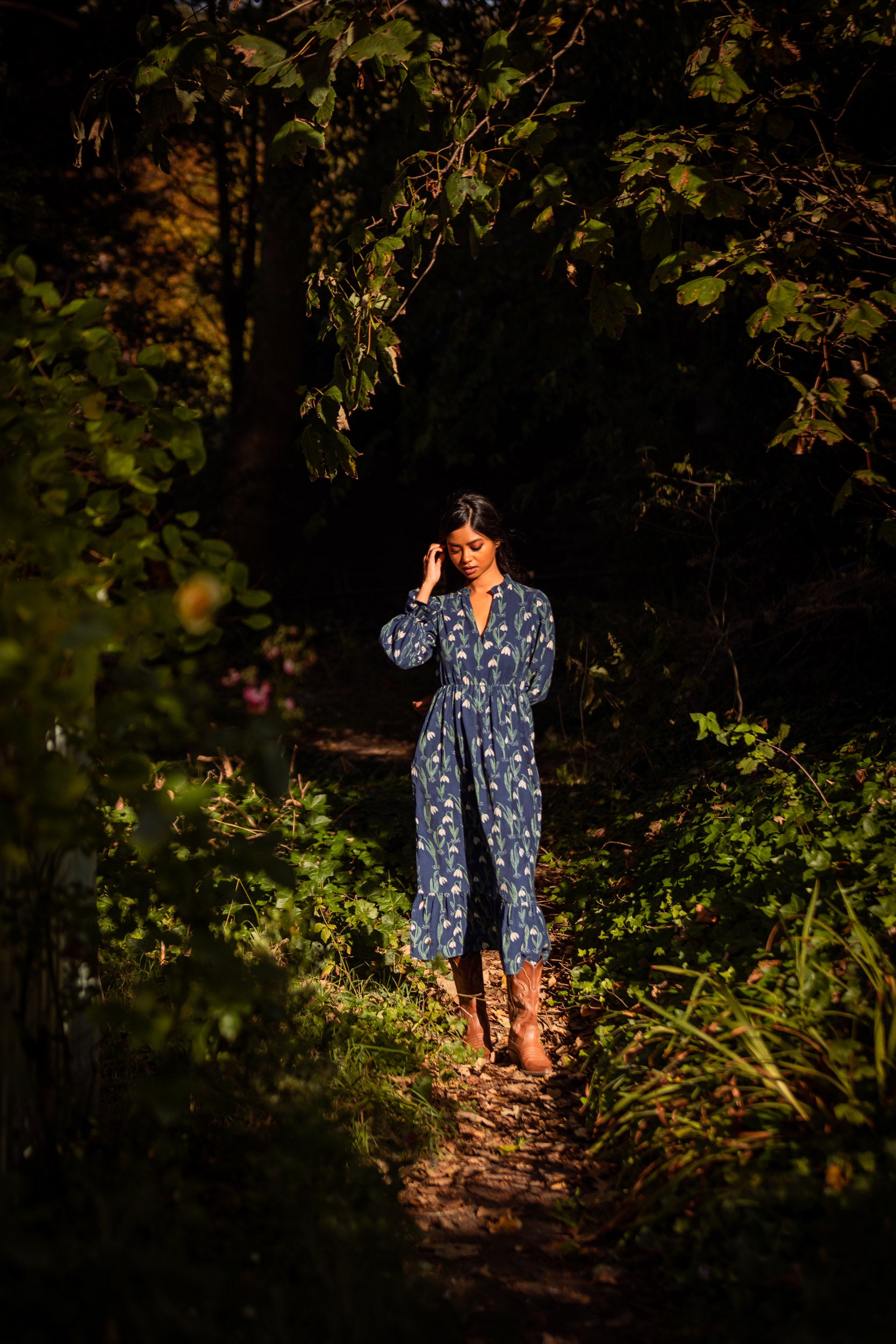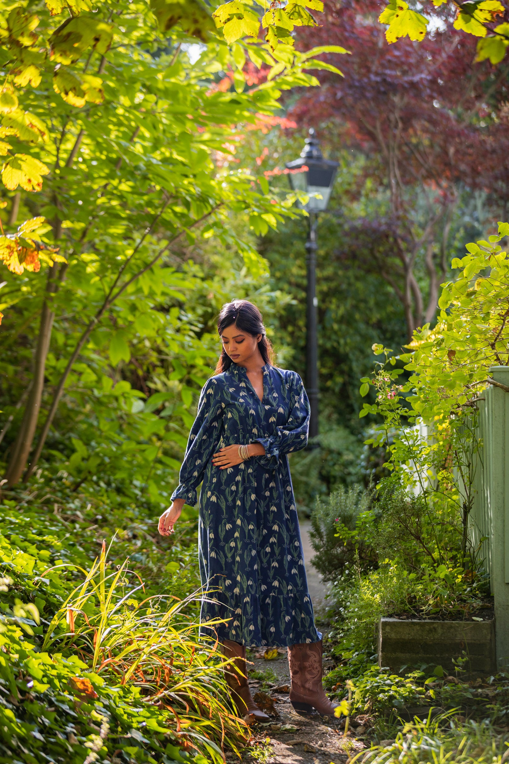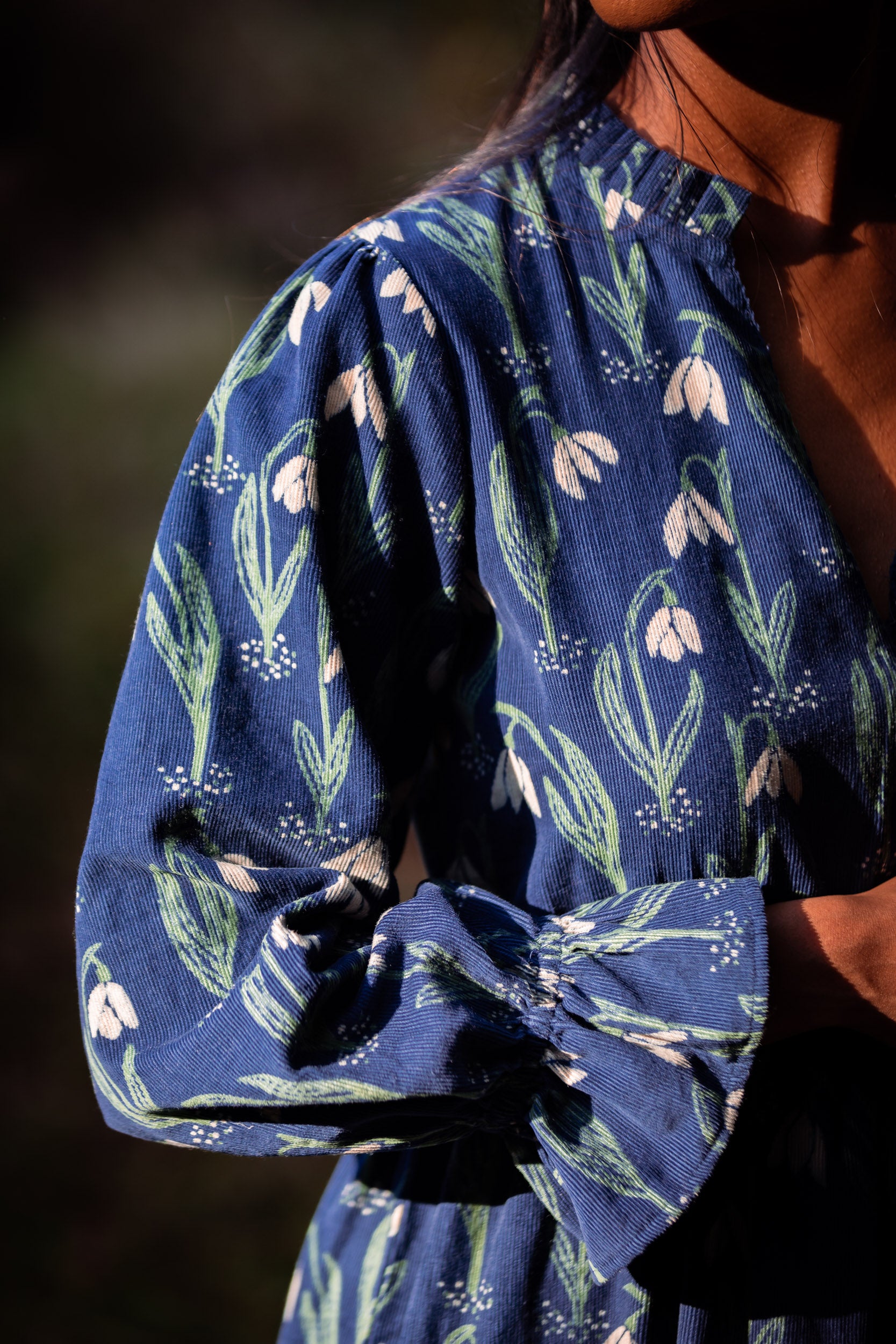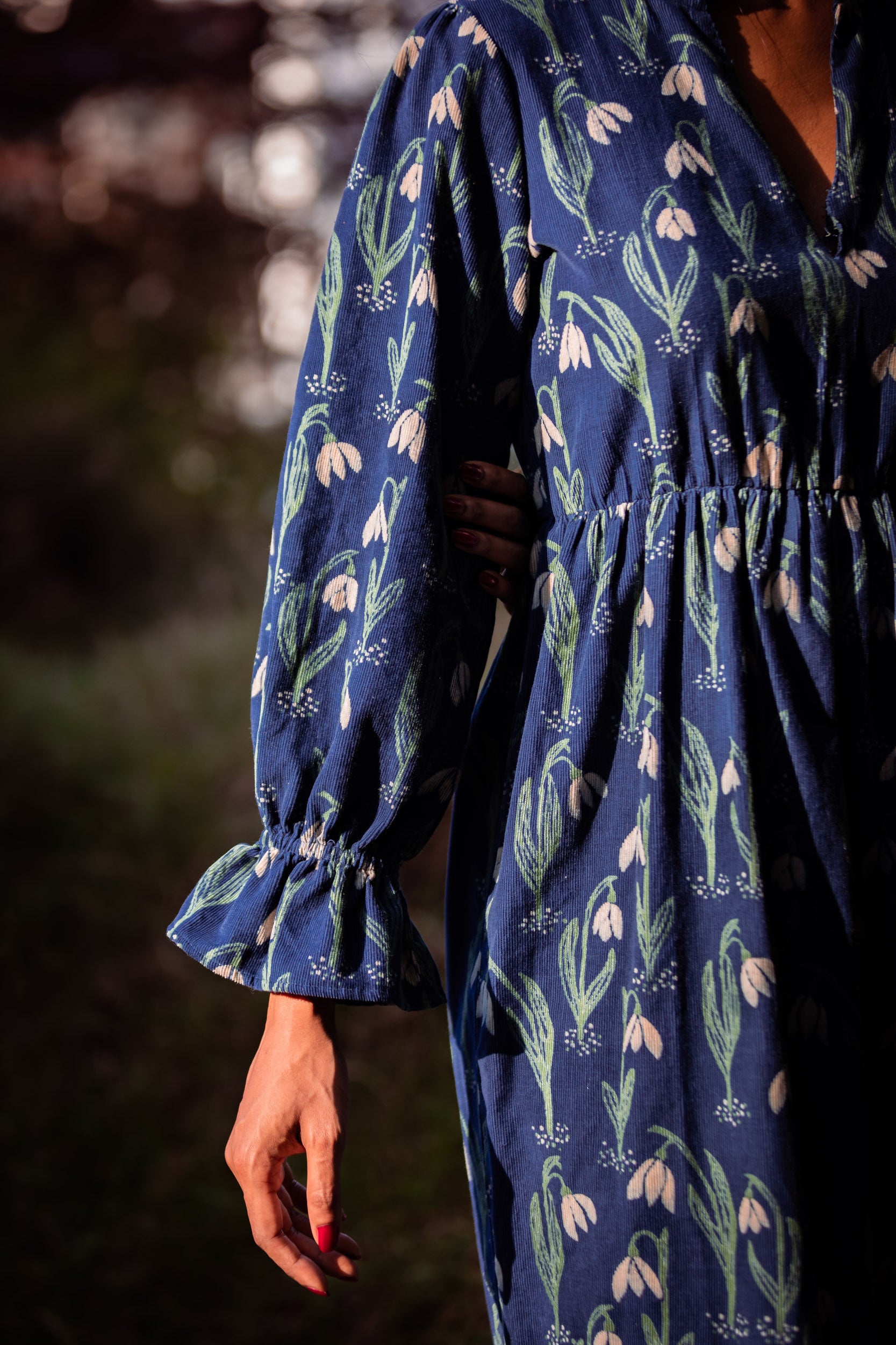 Our screen printed luxurious navy blue corduroy dress is here and it's perfect for the cooler months. With white snowdrops, it is suitably festive for December but also a great Spring staple as well. Snowdrop season lasts December to March!