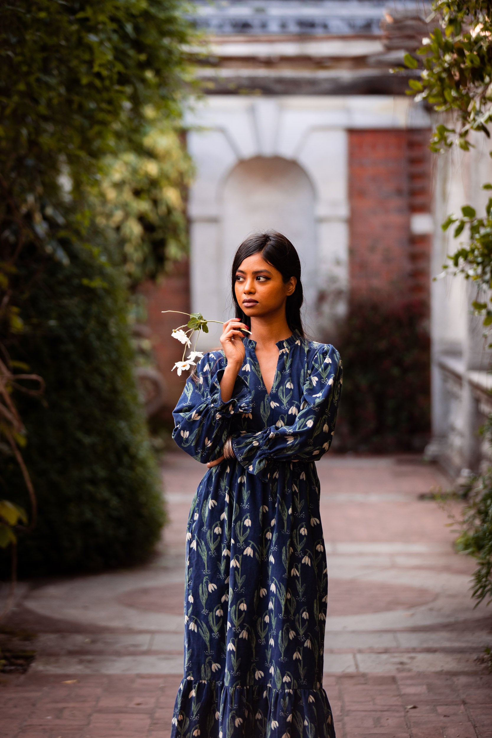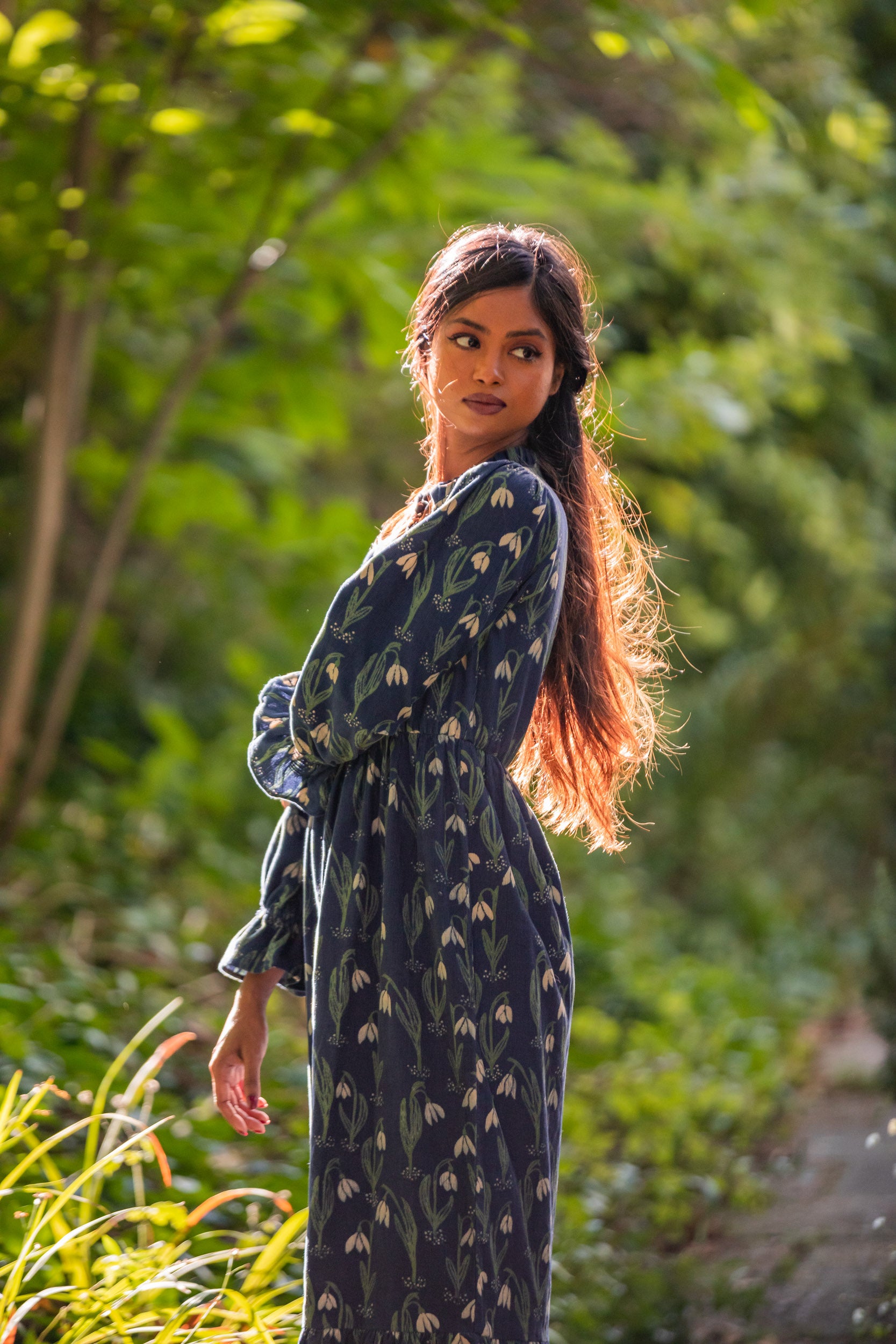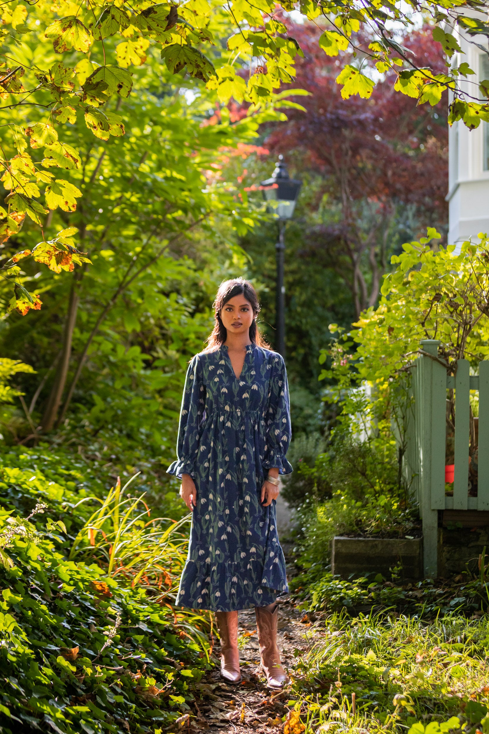 Our screen printed luxurious navy blue corduroy dress is here and it's perfect for the cooler months. With white snowdrops, it is suitably festive for December but also a great Spring staple as well. Snowdrop season lasts December to March!
