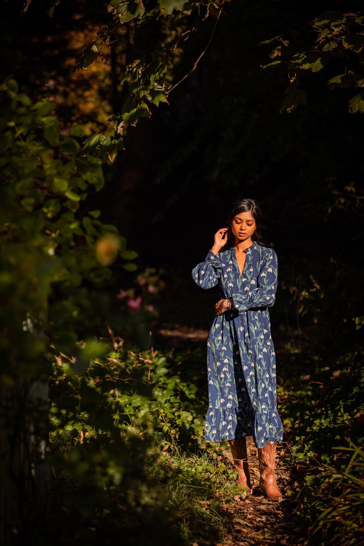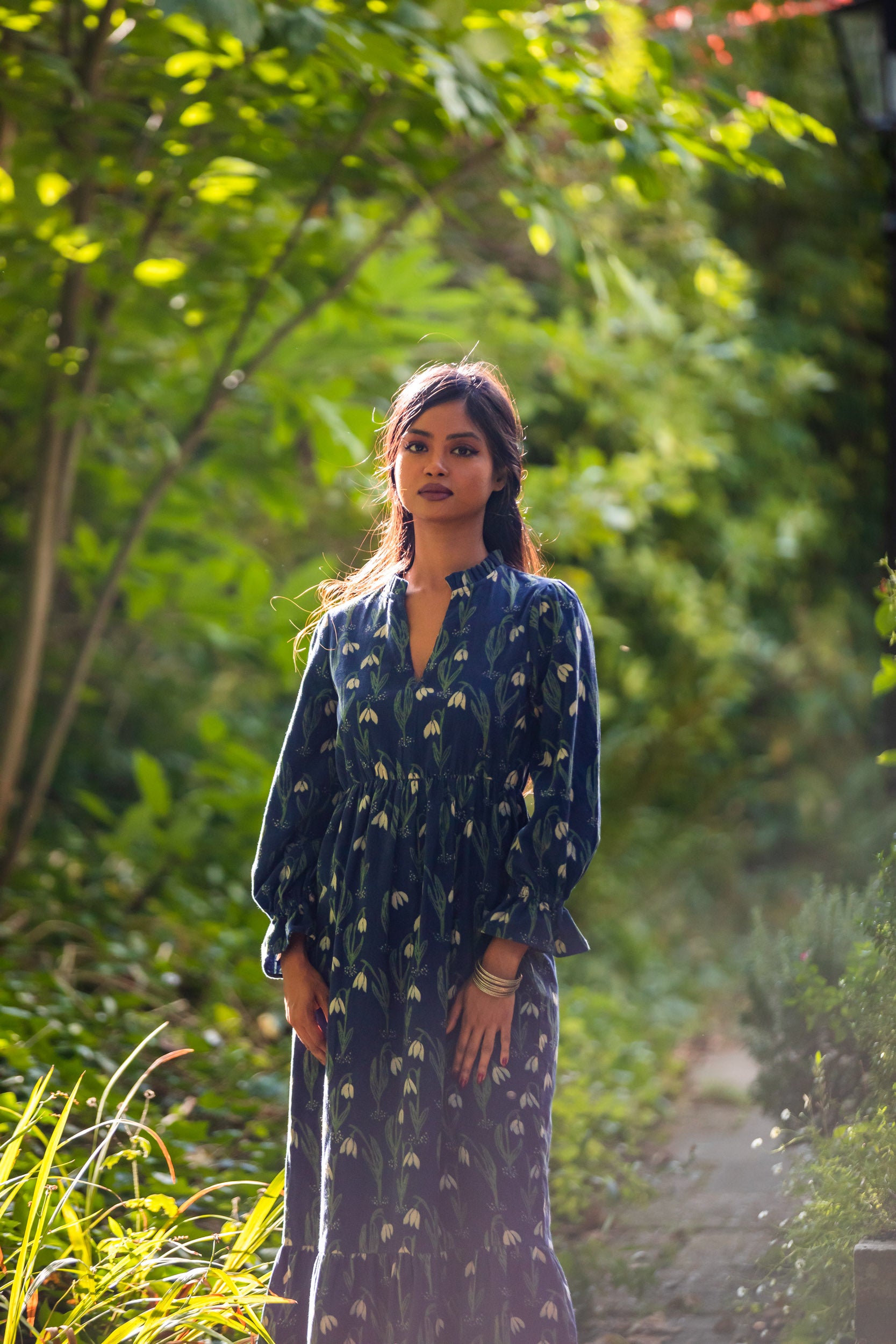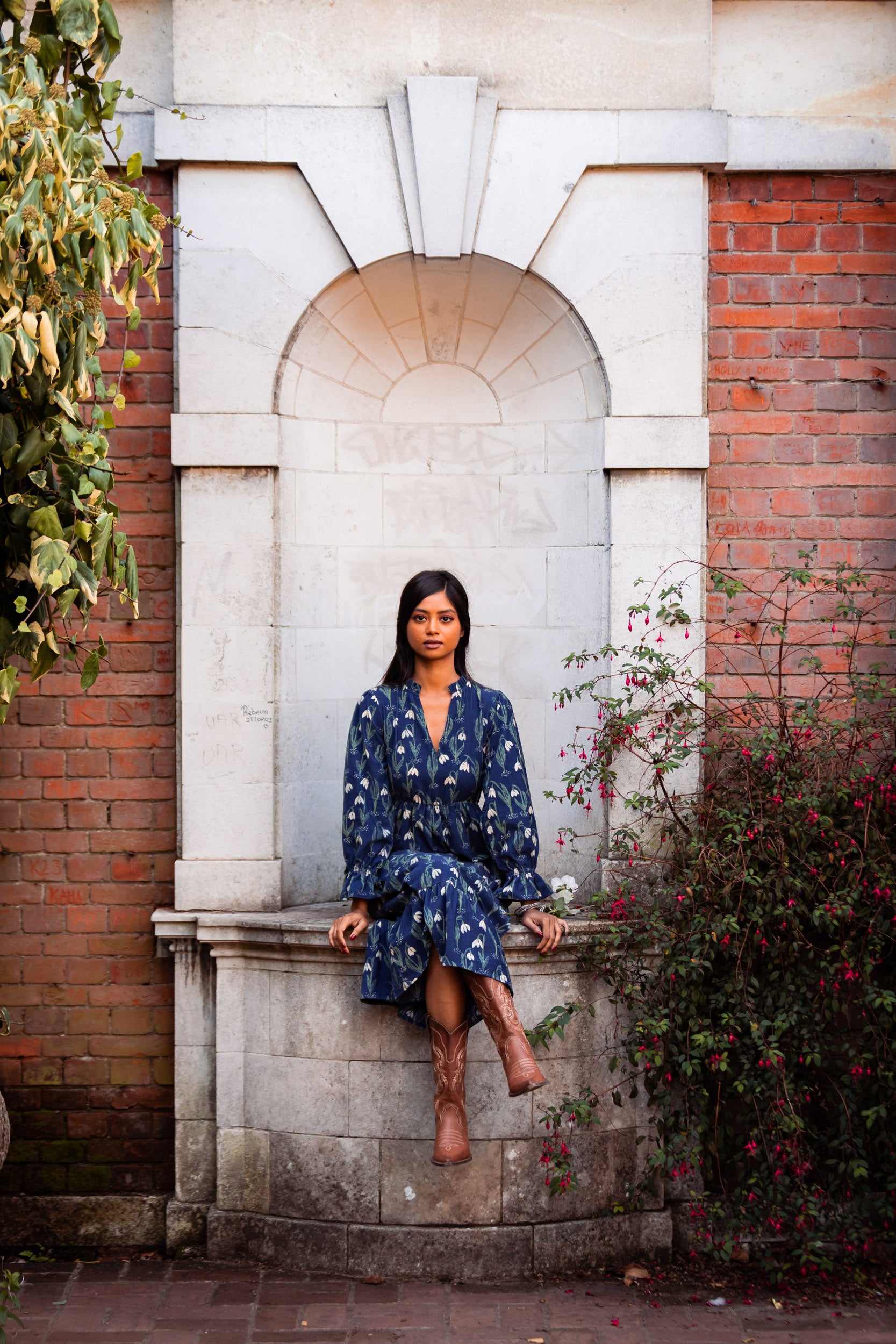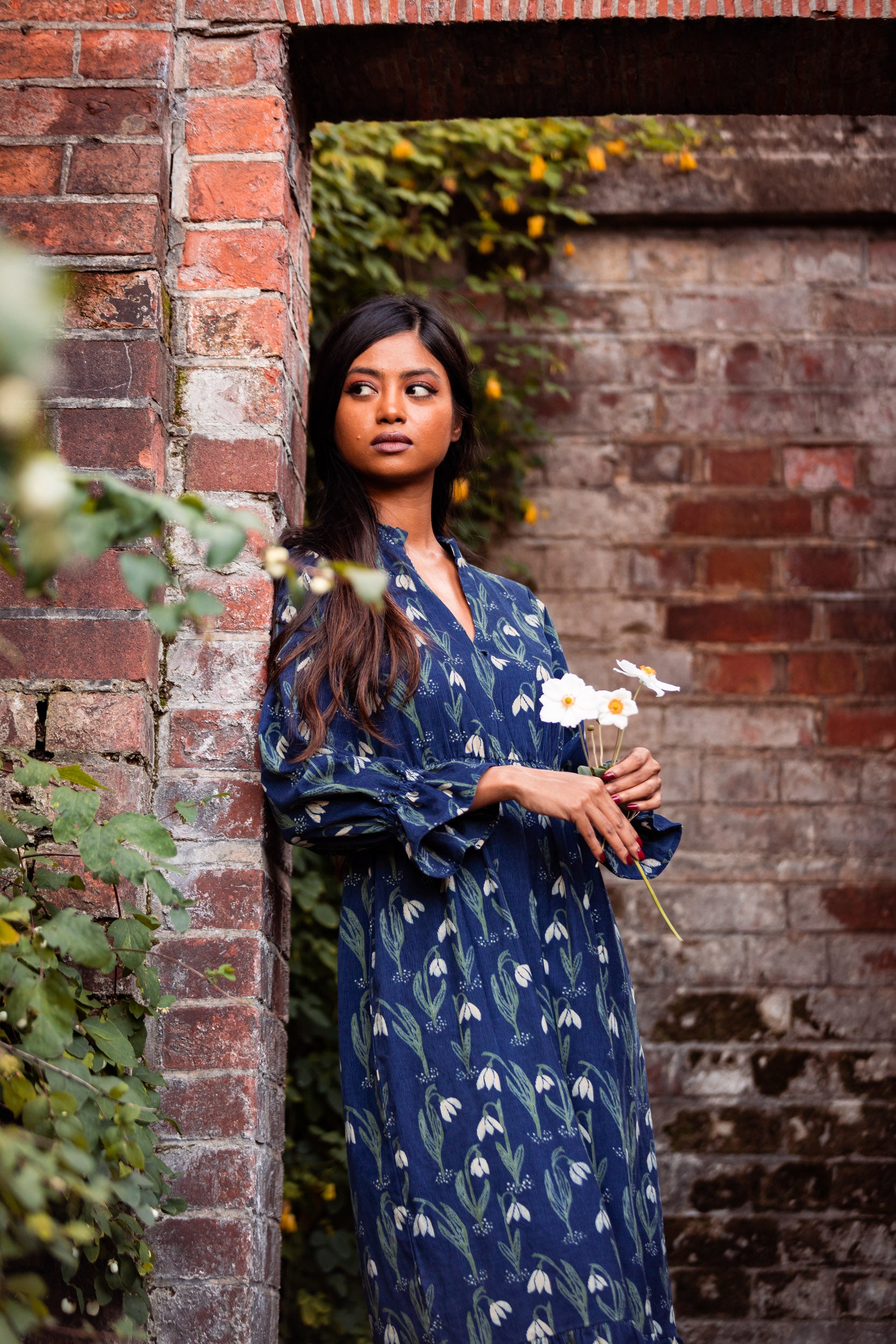 Our screen printed luxurious navy blue corduroy dress is here and it's perfect for the cooler months. With white snowdrops, it is suitably festive for December but also a great Spring staple as well. Snowdrop season lasts December to March!